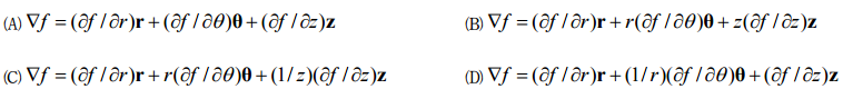 【已刪除】17 若 為∇ gradient,f 為一純量函數,下列何者為圓柱體座標系( r,θ,z ) 上之∇f ?