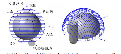 70. 以球形端銑刀銑削凸出的半球面,欲使半球面的殘料較均勻,相鄰兩路徑間距的選擇不宜採用(A)球面上之距 離相同(B)X 方向的間距相同(C)Y 方向的間距相同(D)Z 方向的間距相同。