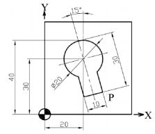 52. 以直徑 10 端銑刀銑削圓弧溝槽,尺寸如下圖,若程式為 G90 G00 XαYβ; G01 Z-3.0 F50; G91 G17 G02 Xγ Y δ R30.0; 則(A)α=11.481, β=-27.716 ,γ=11.481, δ=27.716(B)α=-11.481, β=27.716 ,γ=22.962, δ=0(C)α=11.481, β=-27.716 ,γ=22.962, δ=27.716(D)α=-11.481, β=27.716 ,γ=11.481, δ=0。 (sin22.5°=0.38268, cos22.5°=0.92388, t an22.5°=0.41421)