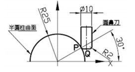 53. 如下圖所示,圓鼻刀(刀徑 10mm,圓角 2mm)與半圓柱曲面(半徑 25mm)的接觸點為 P,則刀端中心 Q 之座標 為