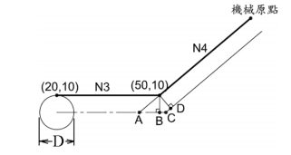 67. 程式 O123;N1 G92 X0 Y0;N2 G42 G0 X20.0 Y10.0 D1;N3 G1 X50.0;N4 G91 G28 X0 Y0 Z0;N5…,D1 為刀 具半徑 。當執行完 N3 時,刀具中心位置不會在下圖所示的(A)A 點(B)B 點(C)C 點(D)D 點。
