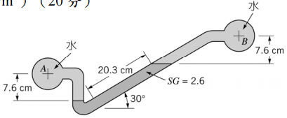 【已刪除】五、如圖所示的傾斜管液壓計,在A管中的壓力為 5.1 kPa,而A與B管中均盛裝著水。液壓 計內的測壓液為比重 2.6 的流體。請問在B管如圖所示的壓力讀數,其對應之壓力為 何?(γ