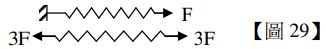 29.如【圖29】將某彈簧的一端固定於牆壁上,另一端以水平外力F向外拉。使彈簧達靜力平衡狀態,該彈簧的伸長量為x。現將同一彈簧的兩端皆3F的水平力向外拉,使彈簧達靜力平衡狀態。已知該彈簧仍於彈性限度內,且忽略彈簧的重量,則該彈簧的伸長量將為何?(A) x (B) 2x (C) 3x (D) 6x