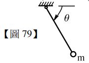 79如【圖79】所示一單擺,單擺绳子長1米、擺錘質量m=1kg。若擺錘由θ=0°、以每秒10米的初速往下擺動,設重力加速度g=10m/sec2 ,則當擺至最低位置時,繩子受力為多少牛頓?(A)110(B)120(C)130(D)140