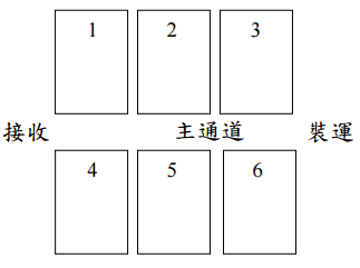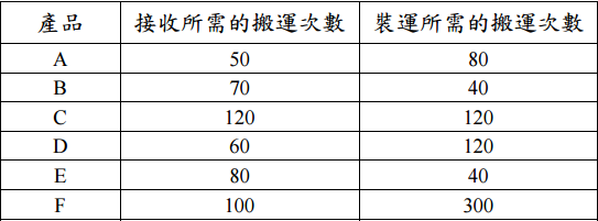 【已刪除】八、若你的批發倉庫有以下 6 個儲區(1 至 6,如下圖)用以放置 6 項產品 (A 至 F), 每次當一個貨櫃來時,需要使用搬運車來接收進儲區,所需的搬運車次數於下表。 又每次客戶要貨時的數量固定且僅需用搬運車一次來運出給客戶。若將一個貨櫃的 運入的產品數量除以客戶的要貨量,即可得其運出所需的搬運次數(下表)。請決 定產品 A 至 F 各應該置於那個儲區?(10 分)