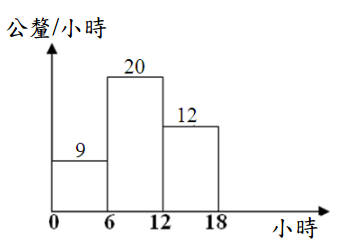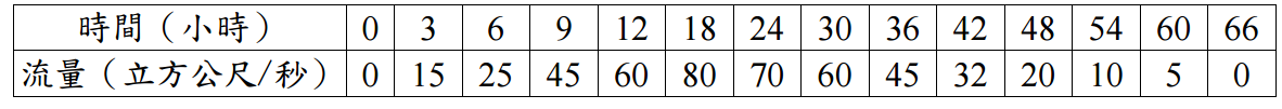 【已刪除】三、某集水區之 6 小時單位歷線(1 公分有效降雨所造成)如下表。若發生如下圖之降 雨,請計算其尖峰直接逕流量(以立方公尺/秒表之)及其發生時間。假設降雨損失 以 6 公釐/小時計。(20 分)