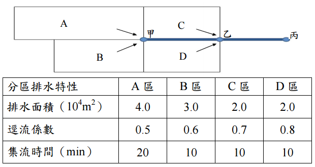 假設水流流經排水管線甲乙及乙丙之時間分別為 3 及 2 min,試計算在管線丙位置 之設計流量。(25 分)