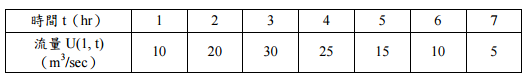 【已刪除】三、某集水區之 1 小時單位降雨為 10 mm 之流量歷線 U(1, t) 如附表,請問該集水區面 積為多少公頃?又集水區之逕流係數(runoff coefficient)約為 0.8,若一場降雨其 均勻降雨強度為 15 mm/hr,且降雨延時大於集流時間(concentation time),試推算 該集水區直接出流洪峰流量。(20 分)