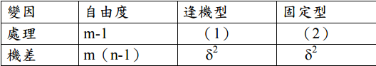 ⑵依上述條件完成其變方分析表中各變因項目及其各別之自由度。(10 分)