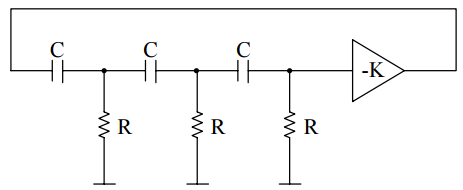 【已刪除】五、下列三階振盪器電路中負增益放大器之 K 值為何時電路才能振盪?又其振盪頻率為 何?(20 分)