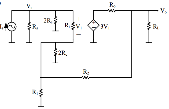 【已刪除】三、試以回授的觀念求解下圖電路之輸入電阻、輸出電阻,及輸出與輸入之電壓增益。 (20 分)