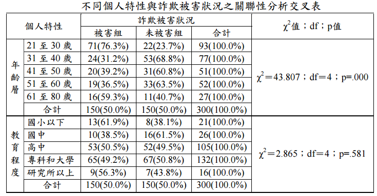 試就上述調查結果,依推論統計步驟,檢定並分析不同個人特性(包括:不同年齡 層、教育程度)與詐欺被害經驗之關聯情形。(25 分)