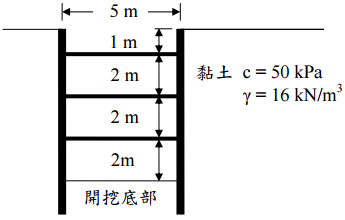 【已刪除】三、如下圖,有一 7 m深之支撐開挖位於黏土中,開挖之長度L = 15 m,寬度B = 5 m。土 壤之凝聚力c = 50 kN/m