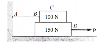 【已刪除】一、物塊 C、D 重量各為 100 N、150 N,物塊 C 左端以繩子 AB 繫於牆上,假設物塊 C、 D 間之摩擦係數為 0.2,物塊 D 與地面間之摩擦係數為 0.3,試求使物塊 D 移動之最 小 P 及此時繩子 AB 之張力。(25 分)