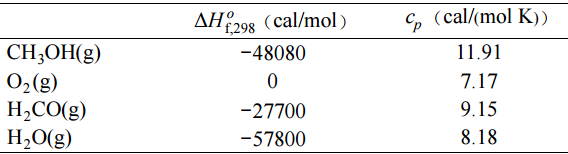 今以甲醇及氧為進料,其流速分別為 100 mol/min 及 50 mol/min,溫度為 100℃,設 反應轉化率為 100%,出料溫度為 200℃,試計算所需之熱(cal/min)。已知以下數 據: