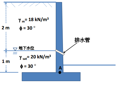 【已刪除】三、請計算下圖擋土牆 A 點以上之側向主動土壓力並繪其分佈圖。(10 分)主動土壓力之 合力與作用點各為何?(10 分)