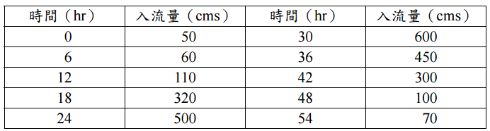 試以馬斯金更法(Muskingum Method)演算該河川之出流歷線,假設 X 值為 0.3 及 K 值為 0.06 day。(20 分)