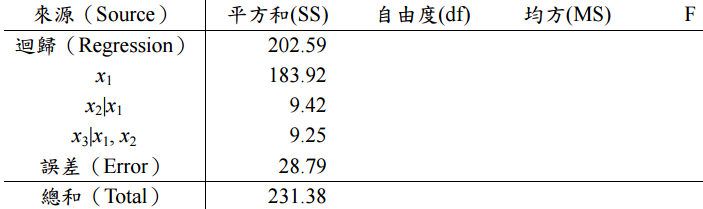 【已刪除】⑶完成下列變異數分析表(ANOVA table)。(10 分)