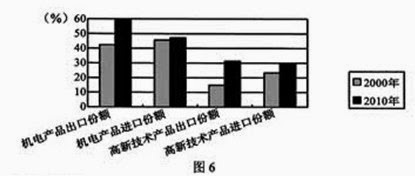 25.2000年至2010年,我国经济高速增长,对外贸易快速发展。机电产品和高新技术产品的贸易统计数据如图6: 从图6可以看出我国 ①进出口产品结构更加优化 ②进出口对GDP拉动作用逐渐增强 ②开放型经济水平进一步提升 ④全方位对外开放格局已经形成 (A)①② (B)①③ (C)②③ (D)③④