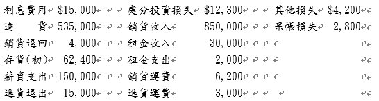 該公司商品帳戶採本期損益法結帳,試根據下列順序於日記簿內作成結帳分錄:(期末盤點,商品計$67,500) 1.商品帳戶結轉銷貨成本。 2.銷貨成本結轉本期損益。 3.銷貨收入、銷貨退回結轉本期損益。 4.營業費用帳戶結轉本期損益。 5.營業外損益帳戶結轉本期損益。 6.依現行稅法預估所得稅。 7.將所得稅結轉本期損益。 8.本期損益結轉業主往來。