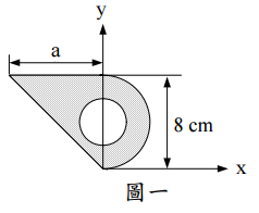 【已刪除】一、如圖一所示,內部圓形之半徑為 2 cm,如斜線面積之重心在 y 軸上,試求 a 之長度? (20 分)
