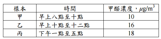 【已刪除】⑴某工作場所某日的作業環境甲醛濃度量測結果如下,請計算該工作場所當日甲醛 暴露濃度的八小時時量平均濃度若干?(10 分)