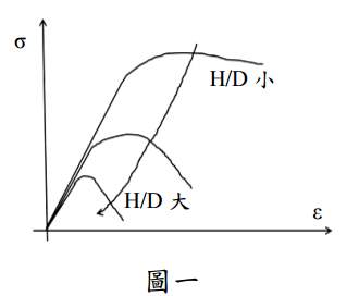 【已刪除】五、岩石強度會受試體尺寸以及環境因子等影響,例如圖一即試體尺寸對單軸壓縮應 力—應變影響示意圖,請仿此圖繪製圍壓、加壓速率、含水量以及溫度對岩石應 力—應變之影響關係圖。(20 分)