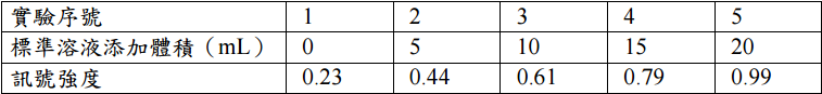 【已刪除】 ⑴以標準添加法分析水中重金屬鈉,標準溶液濃度為 8 ppm,未知溶液體積為10 mL, 數據如下:(8 分)