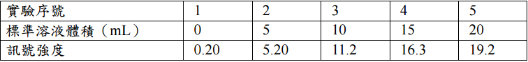【已刪除】 ⑵以內標準法分析水中重金屬鈉,未知溶液訊號強度為 2.9,數據如下:(7 分)