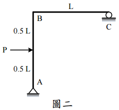 【已刪除】二、圖二為一平面剛架,AB 上承受一水平力 P。各桿件的 EI 值相同且為常數。限以卡 式定理(Castigliano’s theorem)求 C 點的水平位移。(25 分) 註:若使用其他方法,整題以零分計。答案以 P、L、E 以及 I 等表示之。