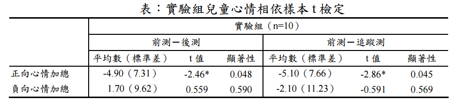 【已刪除】四、最近有一項對於「治療性遊戲團體對降低唇顎裂兒童住院焦慮效果」之研究,其運 用「兒童住院焦慮情緒量表」(包含正向心情與負向心情)作為測量工具,並採取 「實驗組與對照組前後測、追蹤測」的準實驗設計。以下是其對有參加團體活動之 實驗組在不同時間點所測得之情緒得分加以比較(t 檢定)之結果摘要。