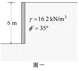 【已刪除】二、如圖一所示,地下水位至少在地表面下 10 m 深。圖中擋土牆向左移,使牆後背填 土壤側向土壓力達到主動條件。試分別計算作用於牆背上 3 m 與 5 m 深度處之側向 土壓力。(20 分)