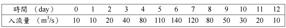 /s。試利用下表之水庫入流歷線,演算求出該水庫之最大流量?
