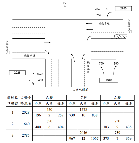 【已刪除】一、請根據下列獨立路口簡圖與表的路口資料設計一定時號誌(Pre-timed Signal),不 限設計方法,請自行假設不足資料,請詳列演算流程與計算步驟。(25 分) [參考資料]Webster 時制計算公式: