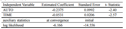 【已刪除】二、有二種運具 Transit、Auto,經 Logit 模式分析後得到下表資料,請計算概似比 ρ