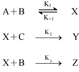 【已刪除】三、下列反應步驟,Y 與 Z 為最終產物,X 為不安定中間產物。請使用穩定狀態假設 (steady-state assumption)求取 Z 之生成速率式。(15 分)