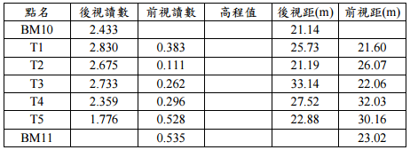 【已刪除】三、實施水準測量作業之觀測紀錄如下表,已知點 BM10 的高程為 30.842 m、另一已知點 BM11 的高程為 43.529 m,請說明水準測量從已知點 BM10 至 BM11 之檢測是否符合 三等精度(± 12mm