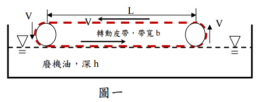 【已刪除】一、已知一廢機油回收設備如圖一所示,其中廢機油槽中儲放深度為 h 的廢機油,因為 該廢機油為靜止,所以廢機油中的雜質會沉降到槽底,而乾淨可回收再利用的清潔機 油則浮在油槽內廢機油的表層,所以,欲利用一座寬為 b 的轉動皮帶在廢機油槽表面 轉動,將乾淨的表層機油帶到轉動皮帶上,再由其他設施將此帶出的乾淨機油回收。 倘若已知下列條件,廢機油密度(