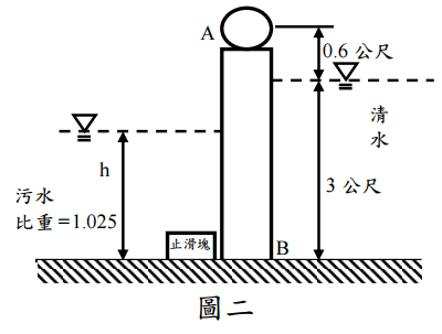 【已刪除】二、已知一污水處理設施的前池為一沉澱池如圖二所示污水區位,其右邊為排水道,兩者 間以一活動水門隔開,該水門上方為一鉸鏈(圖二中 A 的位置),所以,當沉澱池在蓄 存污水其中懸浮固體沉降時,排水道中需事先儲蓄一定高度(約為 3 公尺深)的清水 ,如此沉澱池蓄存污水時,水門才不會任意打開;直到沉澱池蓄存污水達到或高過 某一水深(設為 h 時),此時水門才會打開,並可利用重力排污方式,將沉澱池中 的沉降物體排到排水道中。倘若此設計為可行時,設水門寬為 2 公尺,A 點到清水 水面高為 0.6 公尺,請問該污水池水深 h 為何?(10 分)
