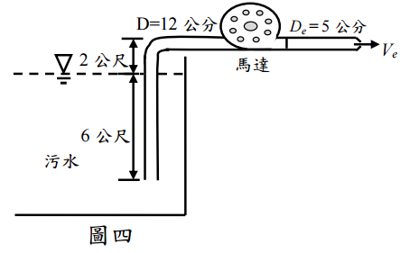 【已刪除】五、若有一座污水池如圖四所示,假設污水密度為 1 公克/立方公分,欲將該池中的污水 以馬達打入污水處理廠,此馬達的抽水量為 250 立方公尺/小時,設此抽水系統的水 頭損失為 6 公尺,而此抽水系統的污水流入污水處理廠的方式為由馬達出水管口直接 送到空氣中再落入污水處理廠,試求出此馬達的抽送污水的功率。(20 分)