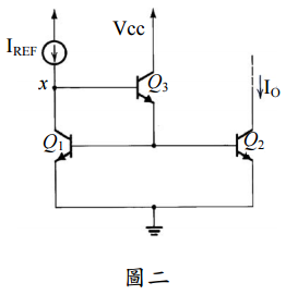 【已刪除】二、圖二電路中,若忽略電晶體輸出阻抗的影響,且所有電晶體的共射極電流增益 (common-emitter current gain)皆為β,則輸出電流I