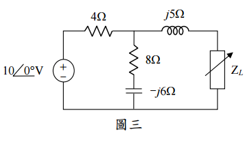 【已刪除】三、圖三之電路中,試求出可變負載ZL可以吸收最大平均功率時之阻抗Z