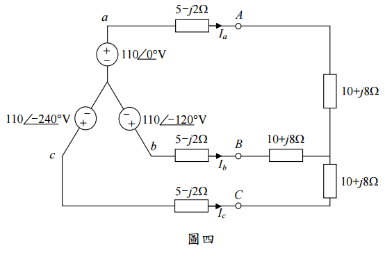 四、試求出圖四中 3 線Y-Y系統的各線電流相量(phasor),即I