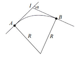 【已刪除】一、某單圓曲線如圖,其半徑為 R,已知兩切線之交角為 α,交點為 I,請列出計算圓曲 線弧長、弦長及 AI 距離之公式。(20 分)