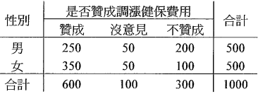 【已刪除】4.隨機訪問1000位成年民眾,詢問[是否贊成調漲健保費用],並記錄受訪民眾的性別資料後,得資 料如下: