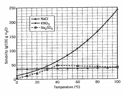 at 80°C is fed to a cooling crystallizer in which the temperature is reduced to 40°C. Determine the temperature at which the solution reaches saturation and the percentage of the potassium nitrate in the feed that forms crystals. (30%)