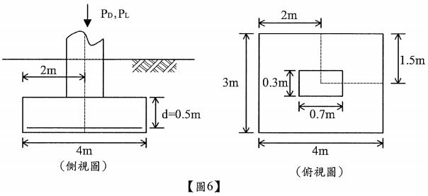【已刪除】八、某一建築物之鋼筋混凝土柱(内柱)基礎如下【圖6】所示,柱斷面尺寸為0.3 m x 0.7 m, 基礎尺寸為4 m x 3 m,承受呆載重P