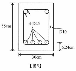 【已刪除】七、有一受風雨侵襲之梁斷面如上【圖5】所示,請檢核是否符合規範規定之撓曲裂紋控制及 淨間距要求,如不符合應如何改善。(粒料最大尺寸為2.6 cm,D10鋼筋標稱直徑0.97 cm ,D25 鋼筋標稱直徑 2.54 cm,fy=4,200 kgf/cm