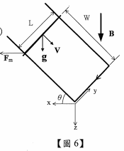 【已刪除】八、在均勻磁場B=B0az的空間中,有一金屬棒(質量M、内阻Ro、長度L)放在導電執道上, 該導電執道與x-y轴之夾角為0,詳如下【圖6】所示。金屬棒受地心重力影響(重力加速 度g ),沿執道以速度V下滑。假設導電軌道電阻、導電軌道與金屬棒間的接觸電阻均忽 略不計,且導電軌道與金屬棒接觸點間無摩擦。 求證:金屬棒沿軌道下滑速率