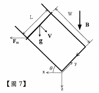 的空間中,有一金屬棒(質量M、内阻Ro、長度L)放在導電軌道上, 該導電軌道與x-y軸之夾角為0,詳如下【圖7】所示。金屬棒受地心重力影響(重力加速 度g ),沿軌道以速度V下滑。假設導電軌道電阻、導電軌道與金屬棒間的接觸電阻均忽 略不計,且導電軌道與金屬棒接觸點間無摩擦。 求證:金屬棒沿軌道下滑速率